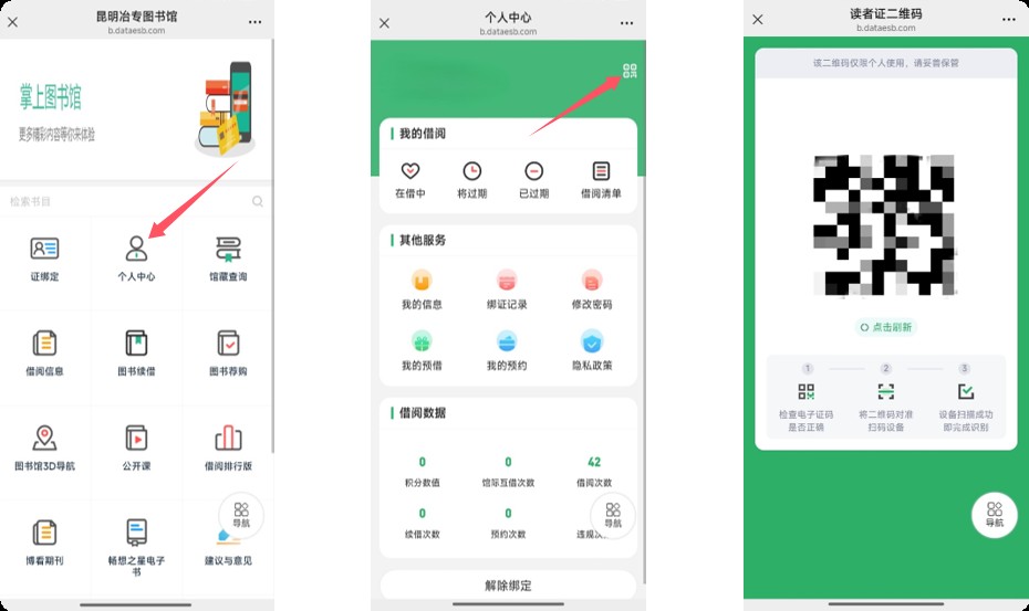 ①扫码入馆。使用电子借阅证二维码在闸机扫描窗口上扫码即可开闸。操作路径:“个人中心”-“电子借阅证二维码”。