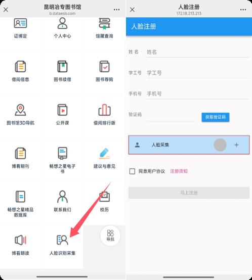 读者可通过注册图书馆门禁人脸识别系统刷脸进入图书馆。注册方法如下:点击”人脸识别采集”,填写相关信息并采集人脸图像。注:注册人脸识别系统需使用校园内部网络(如图书馆或教室内的wifi)