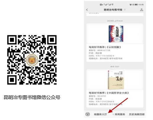 ①关注微信号。微信上搜索并关注“昆明冶专图书馆”公众号,进入“微服务大厅”。